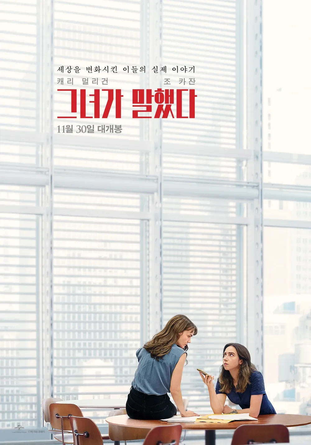 "그녀가 말했다"는 마리아 슈라더 감독의 드라마 영화로, 뉴욕 타임스의 기자 조디 캔터와 메건 투헤이가 할리우드 프로듀서 하비 와인스타인의 성폭력 사건을 폭로하는 과정을 그립니다. 이 영화는 #미투 운동의 시작점이 된 사건을 기반으로 하며, 진실을 추적하는 기자들의 용기와 결단을 담고 있습니다. 캐리 멀리건과 조 카잔이 주연을 맡았습니다.