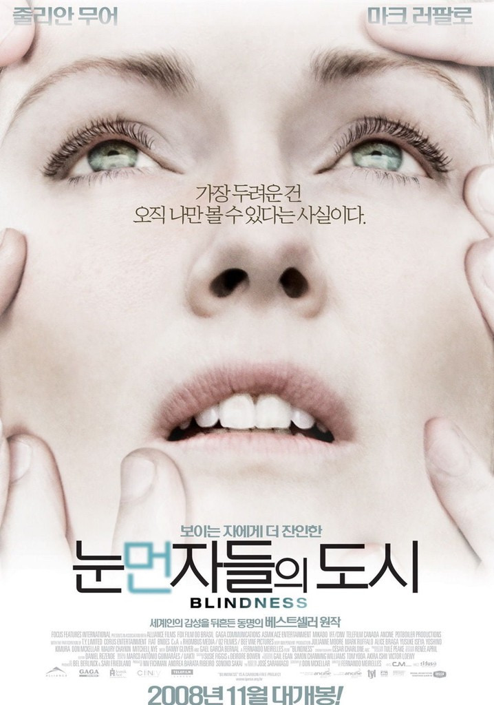 《눈먼 자들의 도시》는 2008년 개봉한 영화로, 페르난두 메이렐레스 감독이 연출했습니다. 줄리앤 무어와 마크 러팔로가 주연을 맡았습니다. 영화는 원인을 알 수 없는 백색 실명으로 사회가 혼란에 빠진 상황을 그립니다. 정부는 실명자들을 격리시키고, 유일하게 시력을 가진 여성의 고뇌와 인간 본성을 탐구합니다. 영화는 소설을 각색하여, 배우들의 이름 대신 역할로 등장인물을 묘사하고, 시각적 단서를 통해 인간의 어두운 면을 드러냅니다.