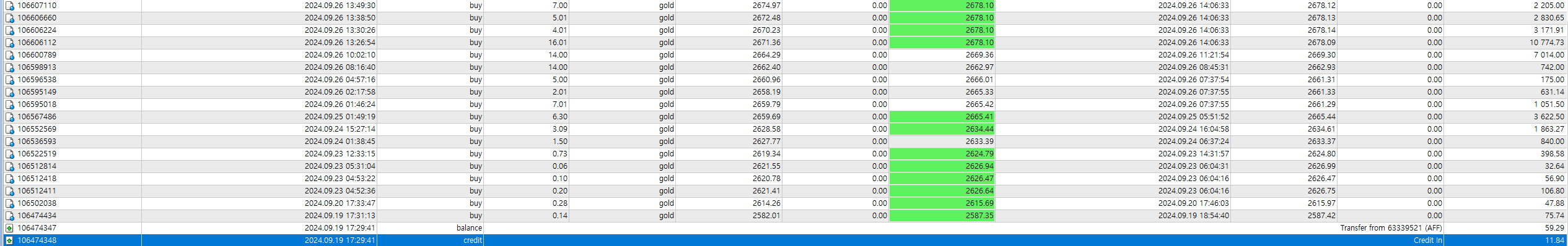 9월 26일 1차매매 3 분할매수 (150 틱 1051.5$, 314 틱 631.14$, 35 틱 175$), 2차 매매 53 틱 742$, 3차 매매 501 틱 7014$, 4차 매매 4차례 4 분할매수 (673 틱 10,774.73$, 791 틱 3,171.91, 565 틱 2,831$, 315 틱 2,205$)
